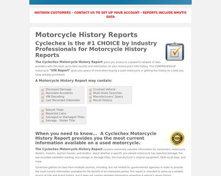 One simple free motorcycle vin check can turn up all the information you need to determine whether a bike is an awesome deal or one gigantic headache. Obtaining a motorcycle history report is a crucial step before selling or purchasing a motorcycle. A cyclechex motorcycle history report provides you the most current information available on a used motorcycle.