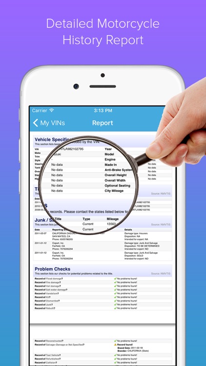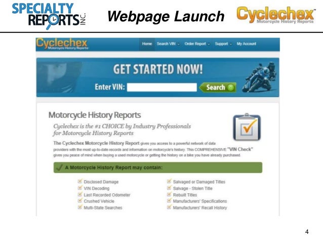 Check motorcycle history report. Aside from vehicle specifications a vin vehicle identification number number may offer information on whether your motorcycle has ever been junked salvaged stolen or recalled or whether it has a clear title or lien. The title on your new bike may have a number of different title brands which can indicate serious problems with the mechanical cosmetic or theft history of the bike. The cyclechex motorcycle history report contains extremely valuable information for consumers motorcycle dealers insurers auction houses and lenders about whether a specific pre owned motorcycle has reported damage the last recorded odometer reading any salvage or damage titles the manufacturers original equipment oem recall data and more.